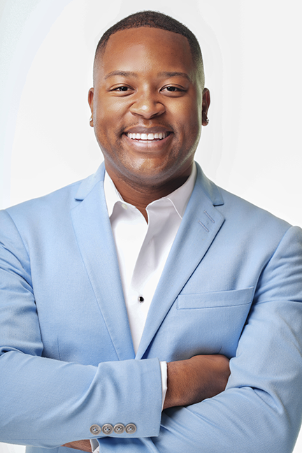Person wearing a light blue blazer over a white dress shirt, standing with arms crossed against a plain white background.