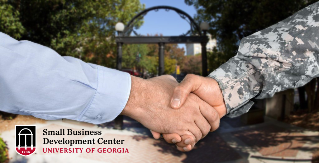 Civilian and soldier shake hands in front of the arch, SBDC logo in corner