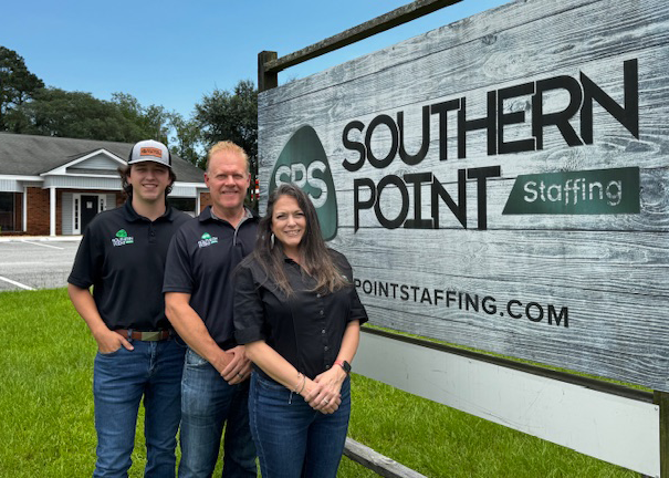 Three people in black company shirts stand in front of a 'Southern Point Staffing' sign on a grassy area with building in the background.